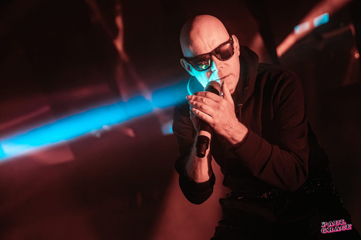 Apart from Eldritch, that stage is dominated by towering rhythm guitarist and backing singer Dylan Smith. All muscle, long blonde hair, and chunky riffs, he’s almost as imposing as the frontman, even when he’s not staring into the crowd from the top of his monitor speakers. Stage left, Ben Christo may appear less imposing, but his lead guitar and voice are essential, adding melody to the band’s industrial march generated by Doktor Avalanche. The Sisters Of Mercy’s long-standing groove machine, providing uncompromising beats, basslines, and occasional synth patches, it’s nursed by Ravey Davey, who lives up to his name by frequently raising his arms like an EDM DJ.