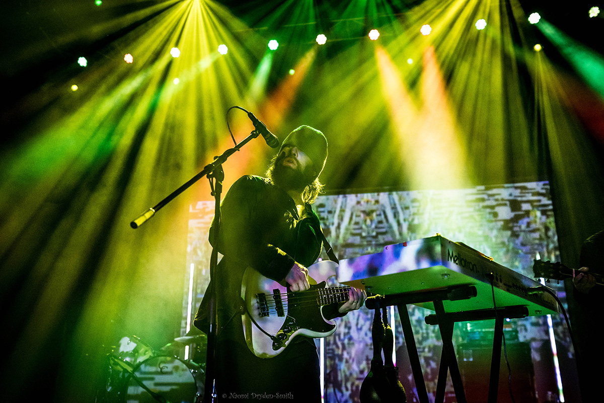 Of course, the psych-rockers do this through the music, which might variously (and lazily) be described as trippy, woozy, and hypnotic. But it’s also in the wholly immersive staging. The films projected onto the screen behind the band feature everything from liquid light shows, kaleidoscopic flowers, and patterns of bendy squares to the kind of warped, distorted footage you might see if you watched a stretched VHS tape. Apart from sudden strobe strikes, the lighting is low and moody, as if to transfer the audience’s attention from the individual band members and back to the music itself. The gaps and banter between songs are kept to a minimum, as if to avoid breaking their spell.