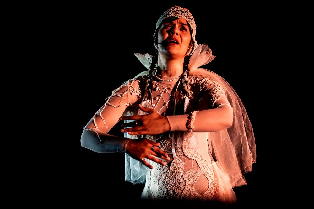 In practice that amounts to a vivid, tightly choreographed production where physical expression is as important as the songs themselves. Dressed in an ornate crochet-and-tulle costume, Khan moves like a trained modern dancer, captivating the Southbank Centre’s Queen Elizabeth Hall with evocative movements, her impeccable voice, and little else. The stage is almost empty, apart from a full-length mirror, a few prop boulders, a couple of musical instruments, and violinist Violeta Vicci (also on viola and occasional backing vocals and drum). With backing tracks used where needed, there’s not even a band to distract.